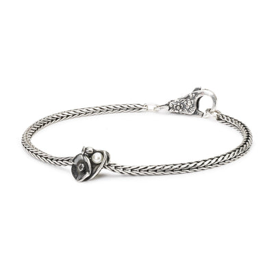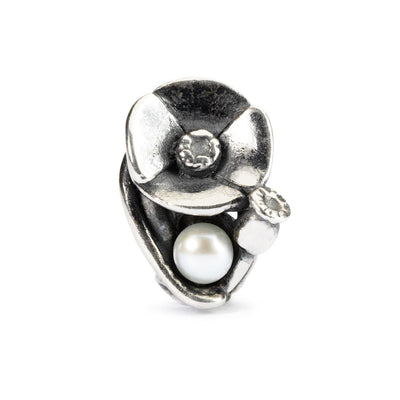 A Sterling silver bracelet decorated with the delicate birth flower of August. Poppies in silver holding a white freshwater pearl as a symbol of beauty. The bracelet is finished with a decorative Lace Clasp. A kind and exclusive gift for August birthdays and occasions.
